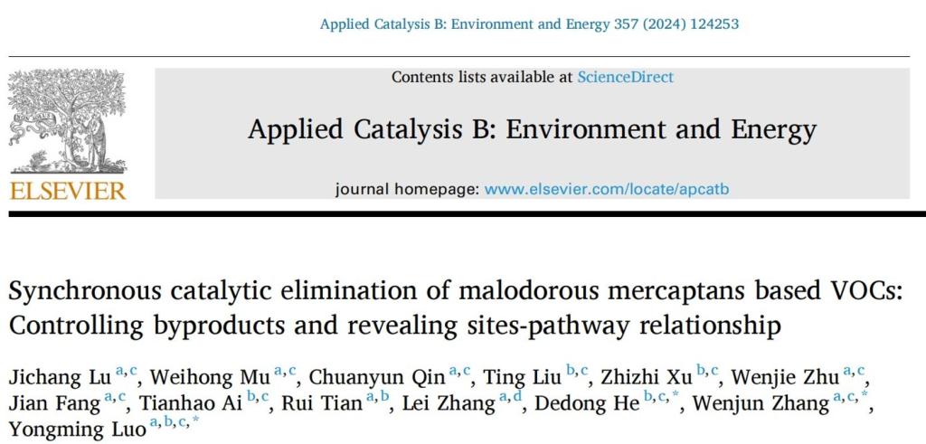 近日,化学工程学院先进环境功能材料创新团队在恶臭含硫挥发性有机物(VOCs)污染控制方面取得重要研究进展,相关研究成果以“Synchronous catalytic elimination of malodorous mercaptans based VOCs: Controlling byproducts and revealing sites-pathway relationship”为题发表在环境催化领域顶级学术期刊Applied Catalysis B: Environment and Energy(IF=22.1)上。我院何德东教授和罗永明教授为论文共同通讯作者。