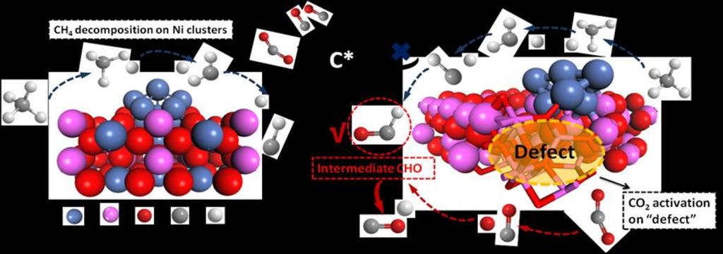 为此,化工院罗永明教授团队通过羟基暴露策略,在Al2O3上开发定制的缺陷位点,稳定活性Ni位点的同时,通过更有效的途径催化CH4干重整(DRM)反应,与传统Ni/Al2O3催化剂相比具有优越性能。构建的空位缺陷也有利于CO2分子的吸附和活化,有效避免了传统Ni/Al2O3催化剂的失活,这一发现为开发高效、耐结焦的DRM催化剂提供了新的机遇。相关研究工作近日发表在环境催化国际顶级期刊Applied Catalysis B(IF=24.319)上。